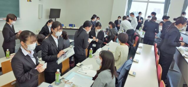 今年度の学外眼科実習指導者打ち合わせ会には協力医療施設のうち、19施設から25名の実習指導者にご参集いただきました。会ではまず、専攻教員が実習指導者と学生に対して当専攻における学外眼科実習の在り方や留意事項等の説明をおこない、その後学生が実際に実習する施設の実習指導者から当該施設での具体的な実習方法の説明を受けました。学生は開会当初、緊張の面持ちだったものの、実習指導者と話し終えると実習への不安も多少和らいだようでした。