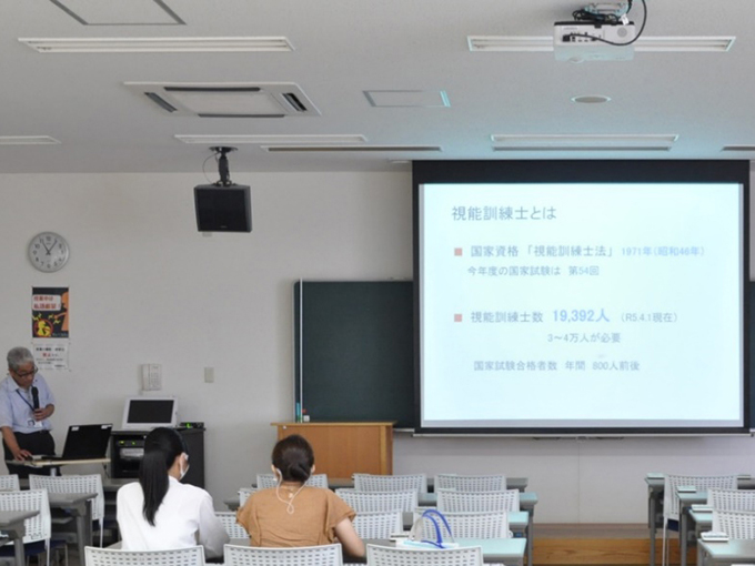 視能訓練士の業務である各種検査を紹介し、給与面や働く場所、就業時間、再就職の割合などを提示し女性が働きやすい職業であることを説明しました。その後、3年間のカリキュラム内容と実習先、遠方の学生が多いことから下宿、学費と諸費用などについて説明しました。