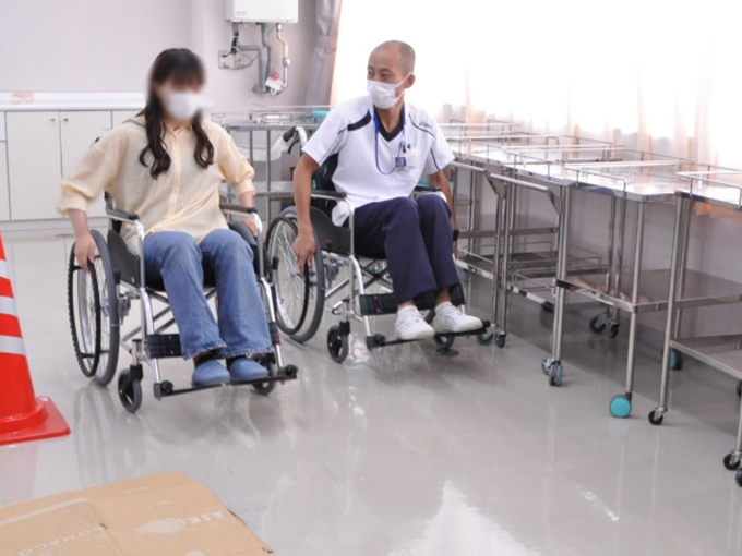 車いす体験の様子です。段ボールで疑似段差を作り、車いす利用者がちょっとした段差でも不自由に感じていることを体験していただきました。