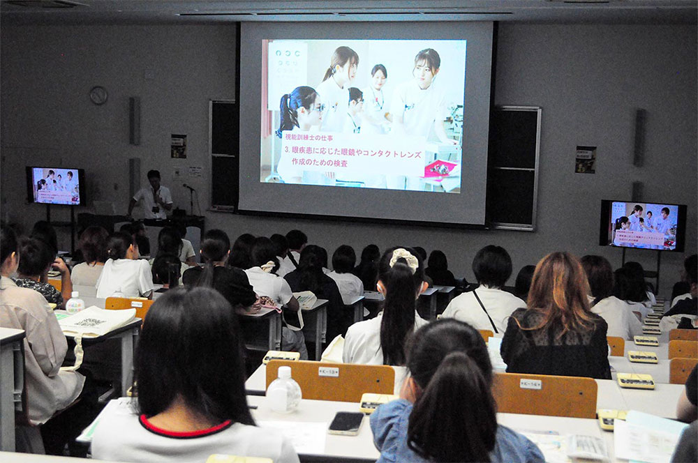 本学の短期大学としての特徴を説明した後、視能訓練士の業務である各種検査を紹介。給与面や働く場所、女性が働きやすい職業であることをデータを用いて説明しました。3年間のカリキュラム内容や実習先、下宿情報、学費についても説明しました。