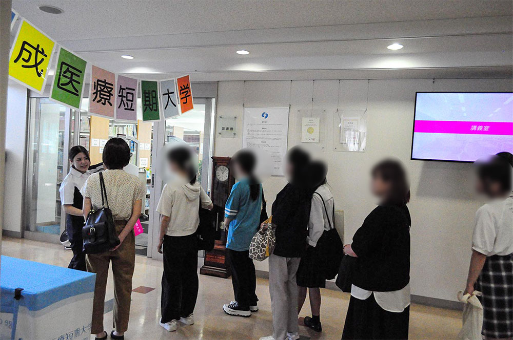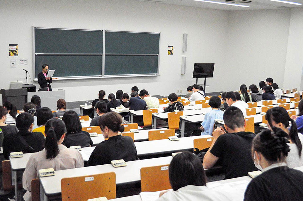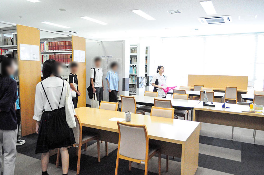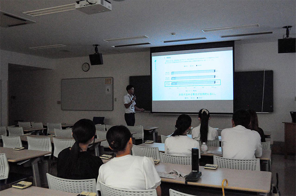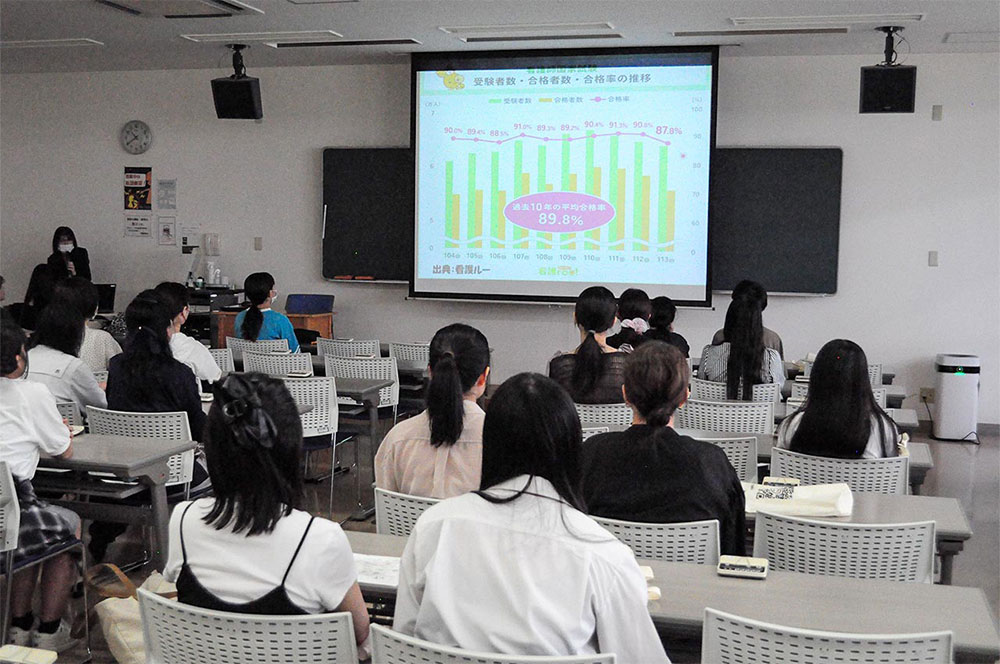 看護師の就業者数や給与などのデータ、勤務体系、本学の強みである系列病院などの施設、教員による手厚いフォロー体制、国家試験の合格率、3年間の総費用について説明しました。また、3年間の授業の流れ、病院実習、学内イベントのスケジュールを写真を交えて紹介しました。