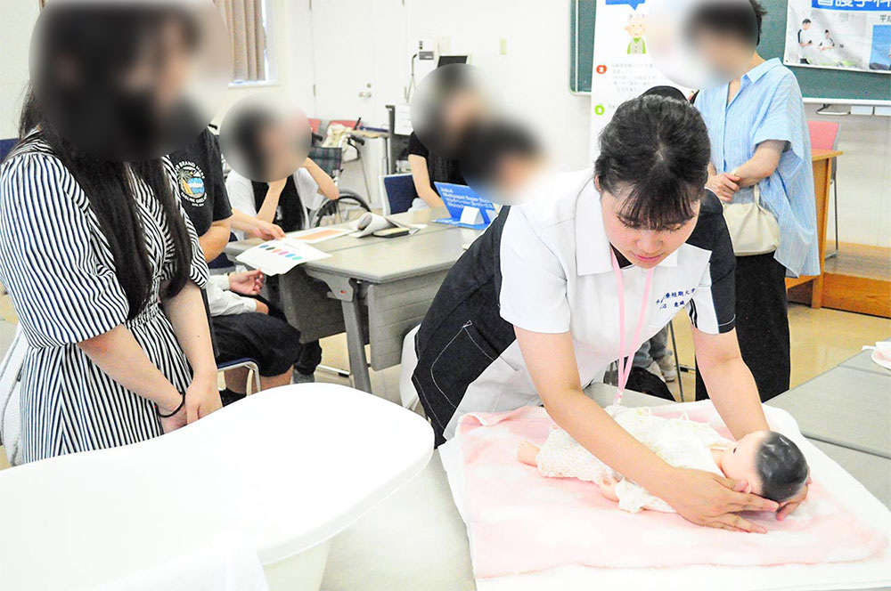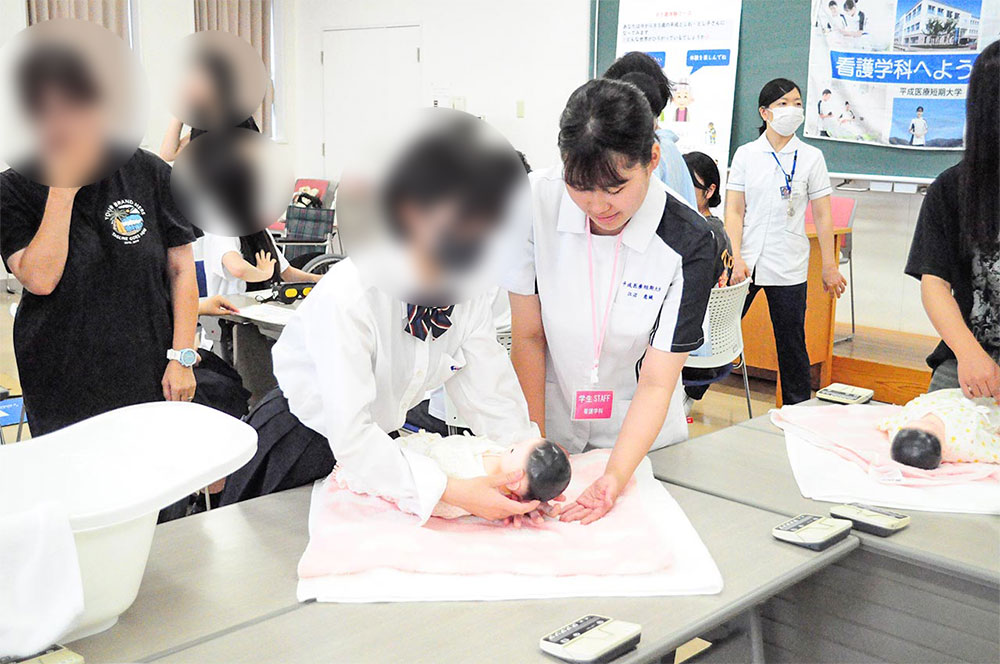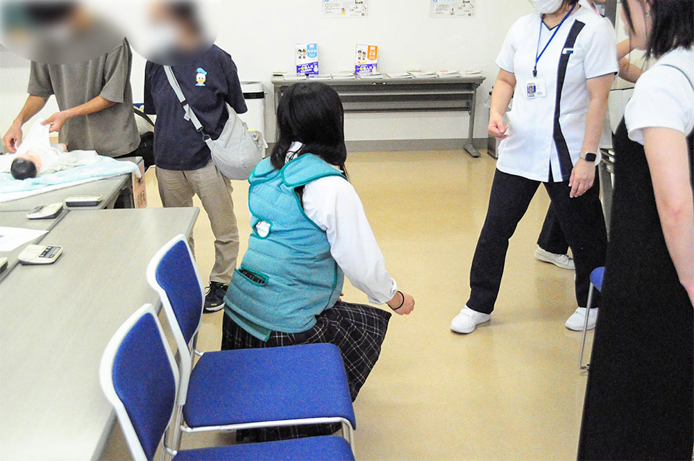 また、小児・母性分野の体験では、赤ちゃんのシミュレーション人形を使った抱っこ・おむつ替え体験や、妊婦スーツを着用して生活行動の不自由さを体験していただきました。