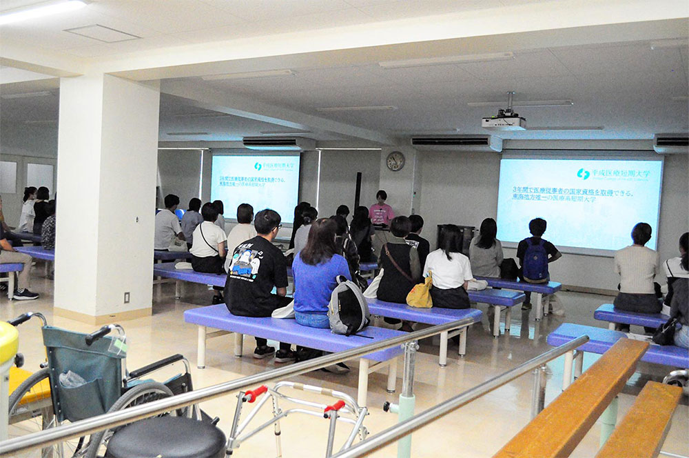 理学療法士の仕事内容を紹介した後、理学療法士になるための大学・短大・専門学校の違いについて説明しました。3年間で国家試験に合格するための学習習慣のつけ方や、教員の学習サポート体制について紹介しました。