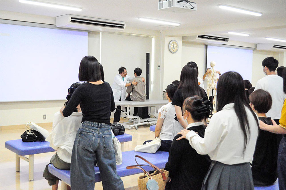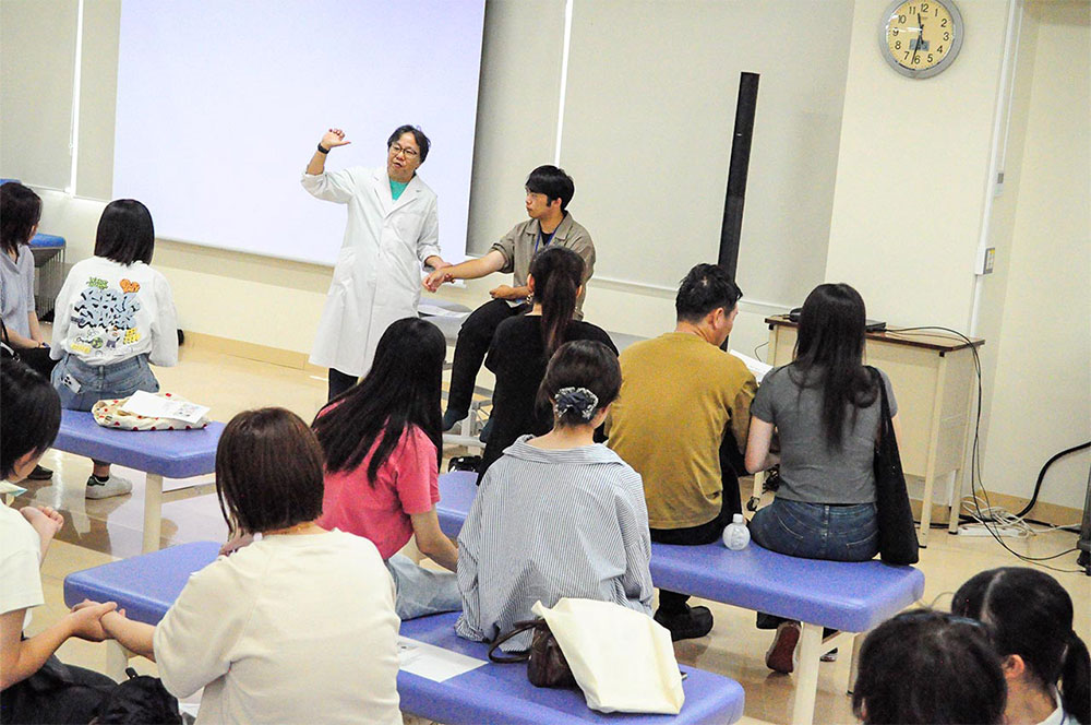 「徒手的物理療法」をテーマに、手を使って患部をマッサージする治療技術について、実演を交えながら解説。参加者にはペアを組んで体験していただきました。