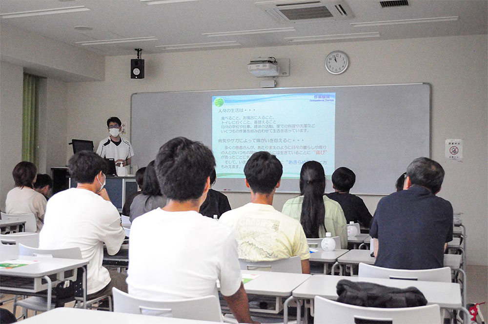 動画を交え、作業療法士の幅広い仕事内容について説明しました。患者さんの症状に合わせたサポートを行うこと、身体的な治療だけでなく心のサポートも行い、活躍の場が大変広いことを強調。本学の実践的な学習例として、高齢者サロン活動や客観的臨床能力試験(OSCE)を紹介しました。また、国家試験合格に向けたグループワークなど、クラス一丸となった取り組みを紹介しました。