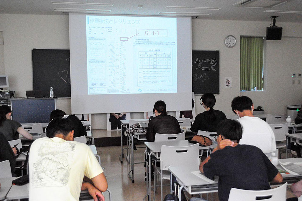 「作業療法とレジリエンス※」をテーマに講義を実施。測定シートを用いた参加者のレジリエンス測定と解説を行い、作業療法士が患者の特性を鑑みてリハビリを提案する方法を説明しました。