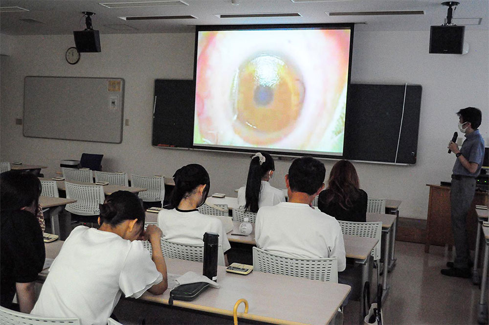 「近視の原因と治療」をテーマに、近視の原因(遺伝的・環境的要素)や治療法としてのレーシック手術を動画で解説。また、コンタクトレンズの特徴についても講義しました。