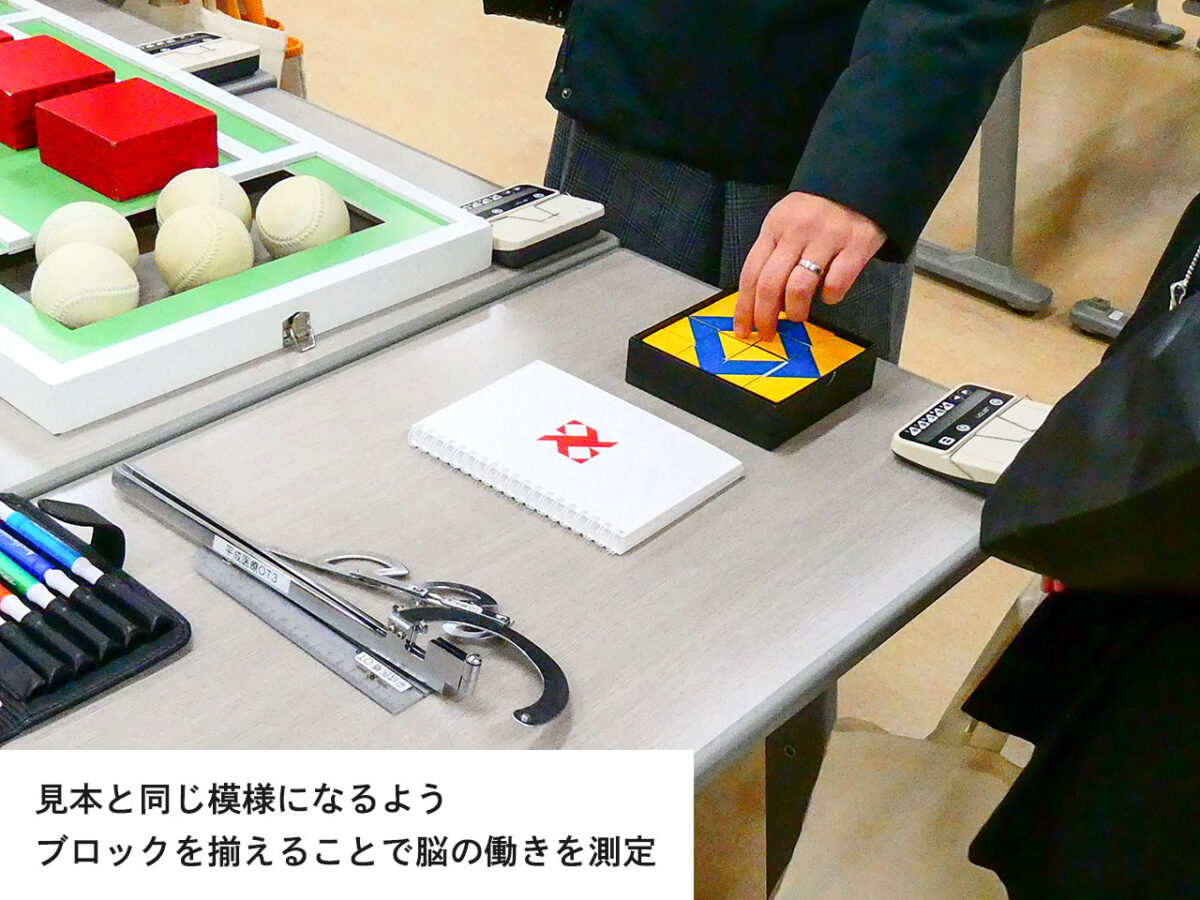脳波測定体験の様子です。頭に機器を装着し、タブレットに表示される問題を解くことで、脳機能を測定できます。