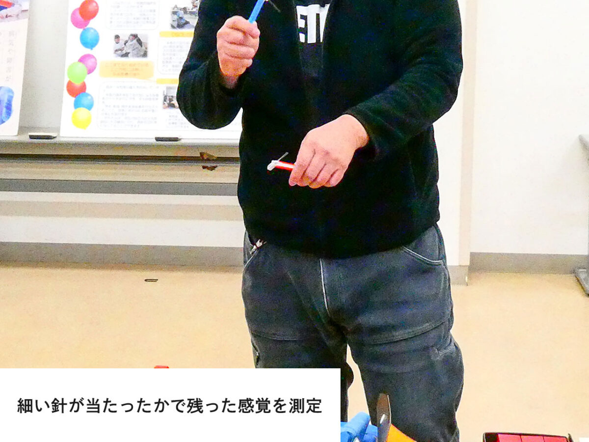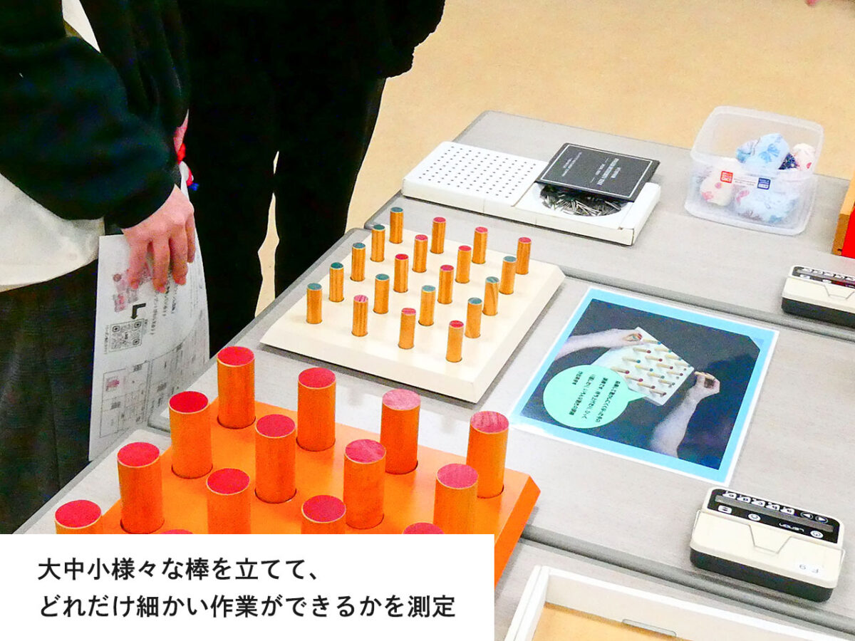 測定器具体験の様子です。病気や怪我で、障害が残る部位やケースは多々あり、作業療法士は残った感覚や運動機能、脳機能を測定し、患者にあったリハビリテーションを行うとともに、患者が日常生活を送れるようサポートします。