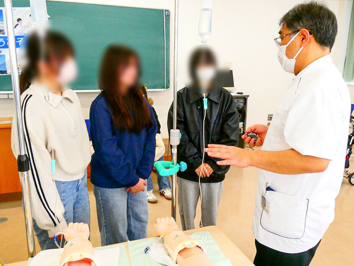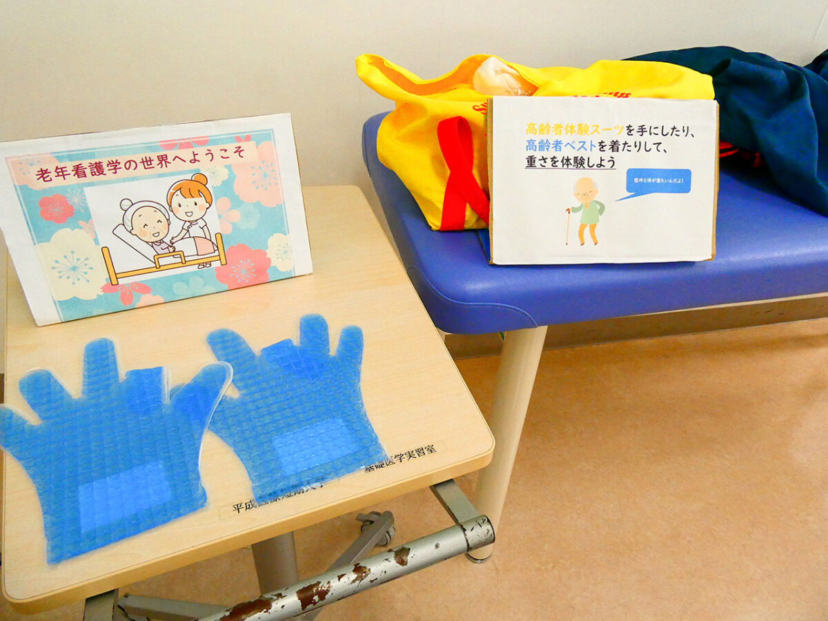 高齢者看護の体験の様子です。体験用のスーツやゴーグルを使い、高齢者の不自由さを実感していただき、高齢者看護の注意点を説明しました。