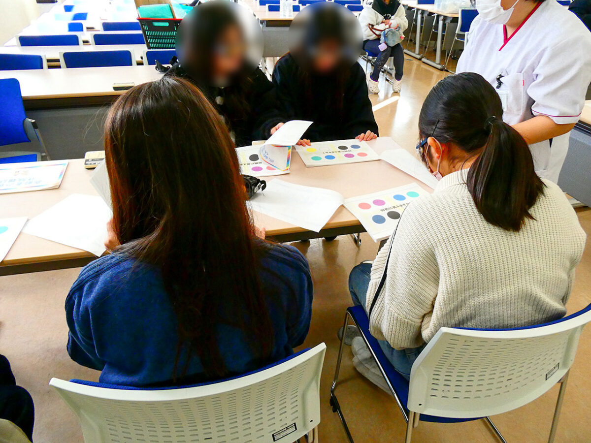 幼児向けの視力検査体験の様子です。違う模様を見てしまう習性を利用して、話ができない幼児にもパネルのどこを見ているかを確認し、視力検査を行います。