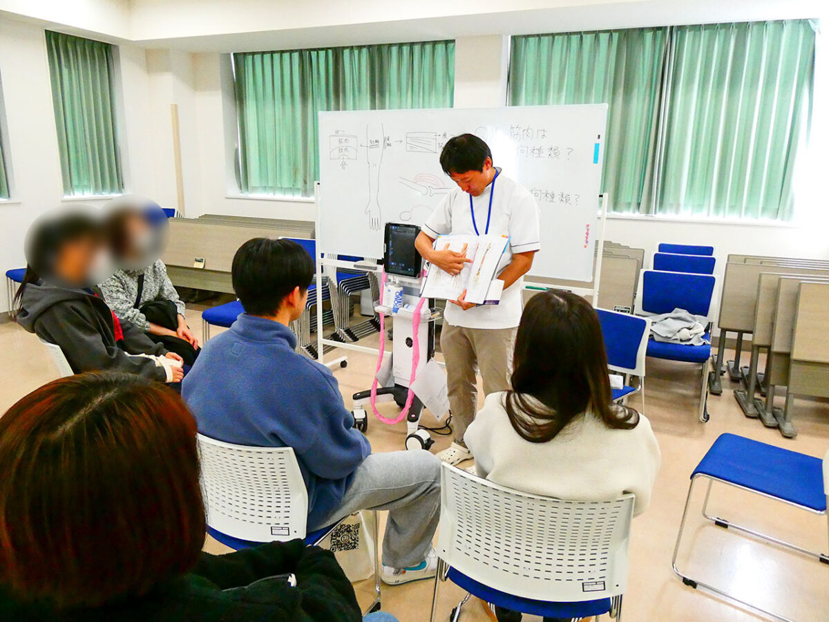 体験講義の様子です。超音波測定機器を使って筋肉の動きをみながら、腕の筋肉の説明をしました。この測定で複雑な筋肉を立体的に見て、異常個所を特定し治療します。また、障害や怪我の検査だけでなく、スポーツ分野ではトレーニング時の可視化に使われることもあります。