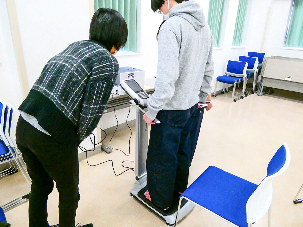 体成分分析体験の様子です。Inbody測定という身体の栄養状態や筋肉・脂肪量の計測により、肥満や骨粗しょう症などの発見の他、運動不足などがわかり食事指導や運動指導を行います。また、スポーツ分野でも適切な食事・トレーニング量の計画に使われることもあります。