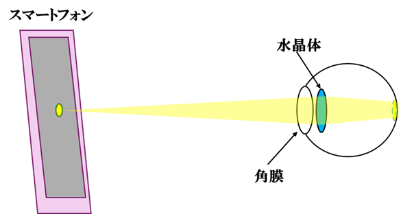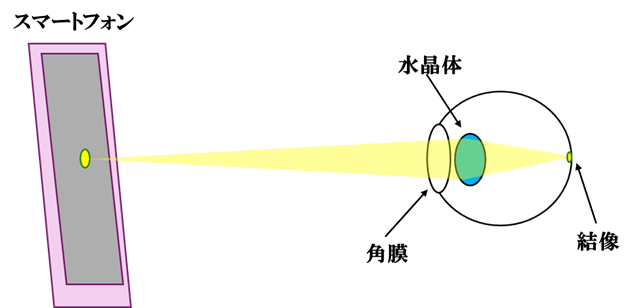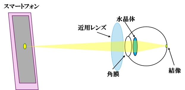 老眼においては、眼前に近用レンズを装用することで水晶体の厚みの不足を補い、スマートフォンの画面像を眼底(網膜)に正しく結像させることができる。
